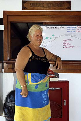 Kay Golding, die freundliche und erfahrene australische Tauchlehrerin ist fürs Tauchen und für die Organisation an Bord zuständig. Sie kennt die Region und die meisten wiederkehrende Probleme ihrer Kunden und hierfür hat sie bereits vorgesorgt. Kay hat mich auf allen Tauchgängen begleitet um mir Ihre Schätze zu zeigen, wofür ich Ihr sehr dankbar bin.